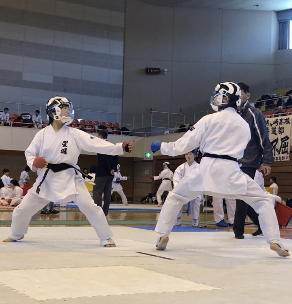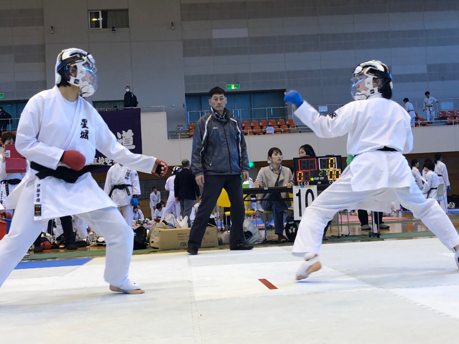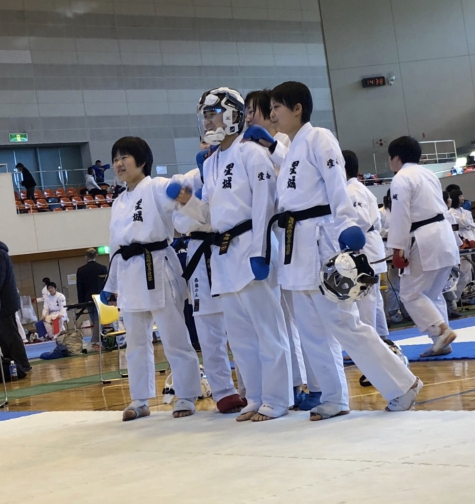 今大会は団体組手のリーグ戦のみです。星城は男子Aチーム・Bチームと女子の3チームエントリーです。私が男子Aチーム、引率で協力してくれた卒業生・畑野真悠先輩が女子チームと、分担して試合に臨みました。また、会場まで応援に足を運んでくれた伊藤鈴稀先輩に男子Bチームを見てもらいました。