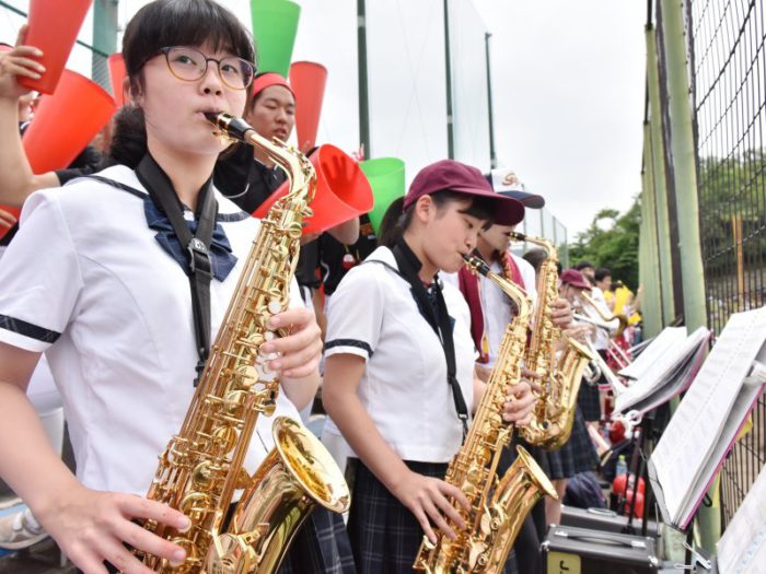 星城高校が一体となって応援する【TEAM☆城】。レギュラー応援団のダンス部・ブラスバンド部に加え、今日は、男子バレーボール部・ソフトテニス部・女子バスケットボール部・柔道部・バドミントン部が加わった大応援団に成長。主に3年生ですが、競技が違えどもお互いを応援する姿勢がすばらしと思います。