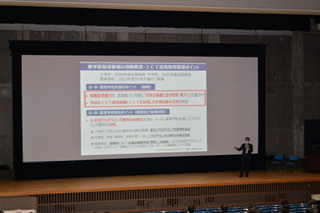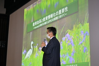 お昼は学食で食堂体験をしたあと、キャンパスを自由散策です。その後、講堂に集合して理事の新津様からICT教育の今後についての講義をしていただきました。