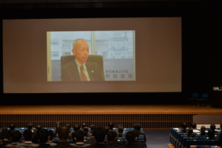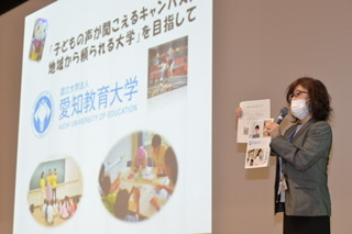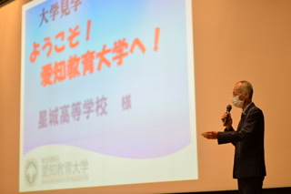 講堂で最初に野田学長からご挨拶をいただき、次に広報の飯浜様から愛教大の詳しい説明を受けました。