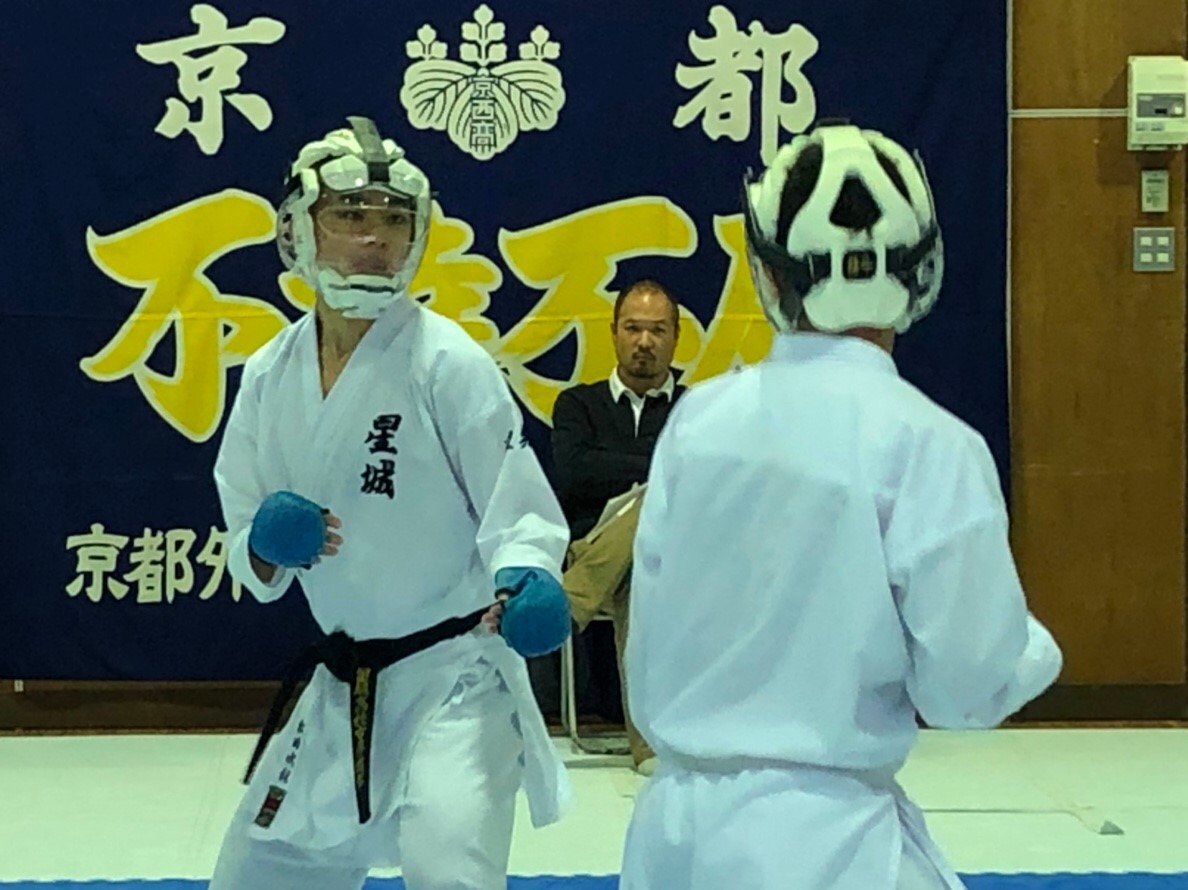 今大会は団体組手のリーグ戦のみです。星城は男子Aチーム・Bチームと女子の3チームエントリーです。私が男子Aチーム、引率で協力してくれた卒業生・畑野真悠先輩が女子チームと、分担して試合に臨みました。また、会場まで応援に足を運んでくれた伊藤鈴稀先輩に男子Bチームを見てもらいました。