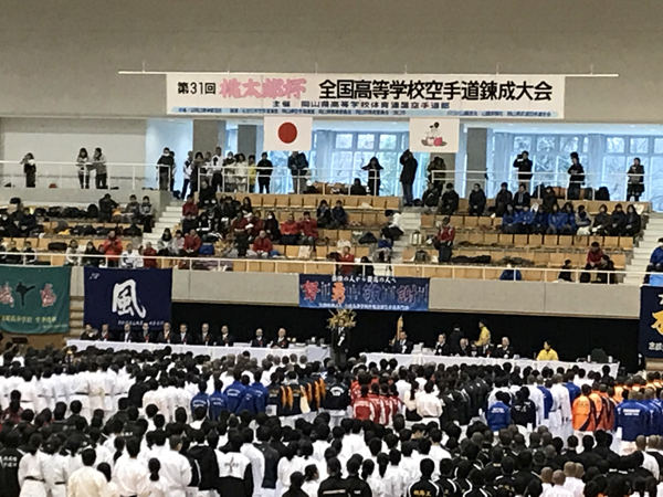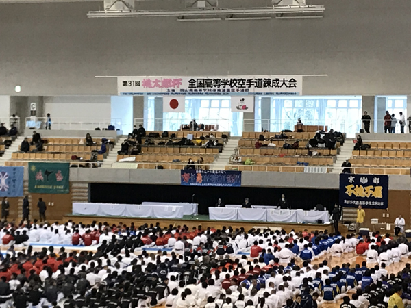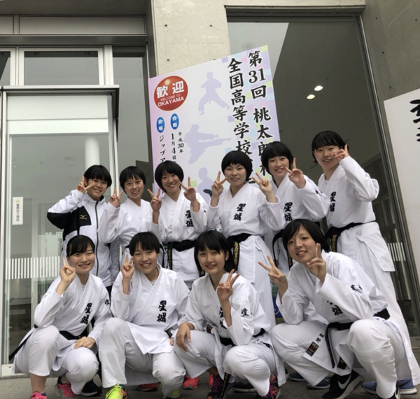 最初の種目は女子団体組手です。審判として身動き取れない顧問に代わり、3年生・安藤実紅が監督代行としてサポートしてくれました。星城高校は2回戦スタート。2回戦の相手は、昨日の練習会でも対戦した兵庫県・有馬高校です。先鋒は動きが硬く引き分けたものの、次鋒から大将までは勝利することができました。3回戦の相手は、開催校である岡山県・おかやま山陽高校。こちらは、ストレートで勝利しました。4回戦の相手は福岡県・博多高校。先鋒は勝利するものの、次鋒から副将までを1ポイント差で負けてしまい、ここで終了、ベスト16です。残念ながら入賞には届きませんでした。
