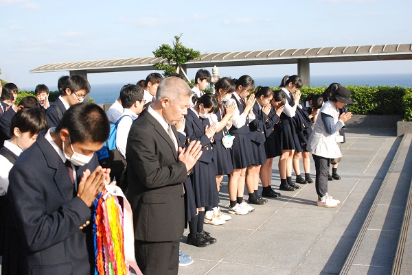 修学旅行団1班は現在、平和祈念公園やひめゆりの塔を見学しながら、平和学習を行っています。沖縄戦の悲惨さ、惨さを知り、、平和の尊さや大切さを学びます。事前学習で記念館で発表を聞きましたが、実際に資料館などを目で見たり、平和ガイドの方の話を聞いていると、私たちが平和に暮らすことができていることが、どれだけ尊いことなのかを改めて感じました。