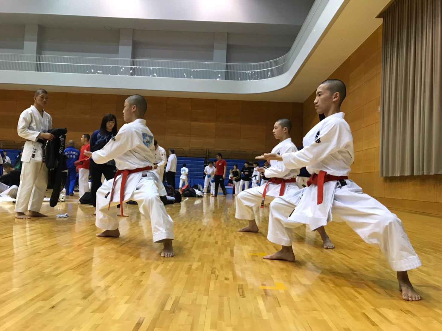 3/25、いよいよ大会が始まりました。本日は開会式の後に形競技の1・2回戦です。愛知県から飯田ももの先輩が、会場まで駆け付けてくれました。ありがとうございます。
