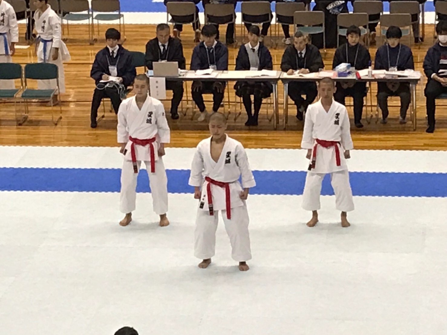 1回戦は近畿地区・神港学園高校が相手でした。こちらも結果は1-4の敗退です。緊張からか、練習では見せたことないミスが出てしまいました。しかし、1年生3人による今回の出場は大きな経験になったはず。団体形競技は来年までありませんが、今回の悔しさを来年に晴らしてもらいたいと思います。