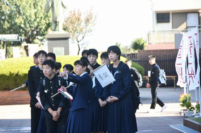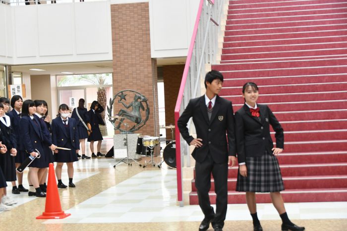その後、アトリウムでは、来年度からの新しい制服のお披露目や、軽音楽部・ダンス部・空手道部による演奏や演技が行われました。