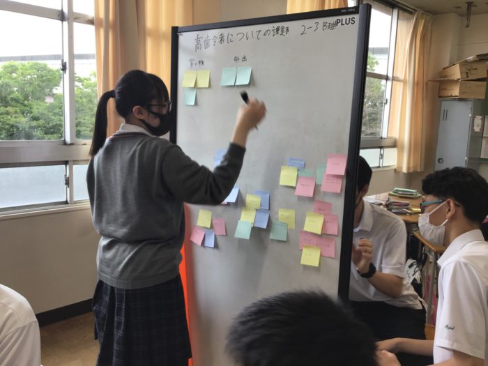 後半は教室に戻り、今日の講義をもとに、もう一度、班でしっかりと「高齢者の健康寿命」について考え、話し合い、班としての意見としてまとめることができました。