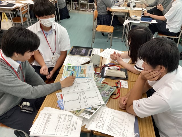 6限、パンフレットの構想をもとに、表紙の担当、各日の行程表の担当、持ち物や注意事項の担当など、それぞれ役割を分担してパンフレットづくりを進めました。講演で教えていただいたように、まず訪問地を決めて、地図で場所を確認し、それぞれ効率的に回れるように交通手段を考えました。時間的に無理のない、余裕をもった計画を立ててほしいと思います。