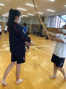私は、剣道経験者ですが、「武道探究B」は誰でもできるような「基本打ち」をはじめ、素振りなど初心に帰って剣道ができました。先生の分かりやすい指導でみんな仲良く、助け合い授業を行っています。できるようになった時に共に喜びを分かち合えることがよかったです。