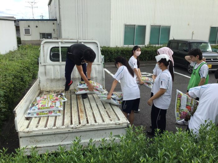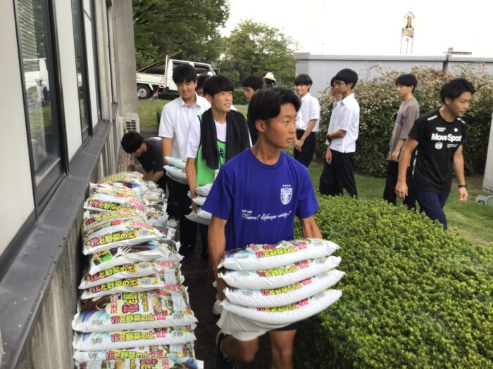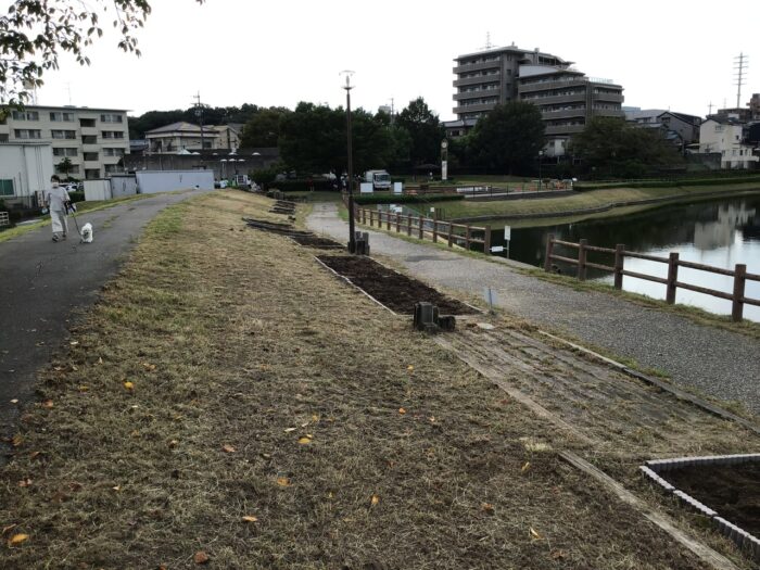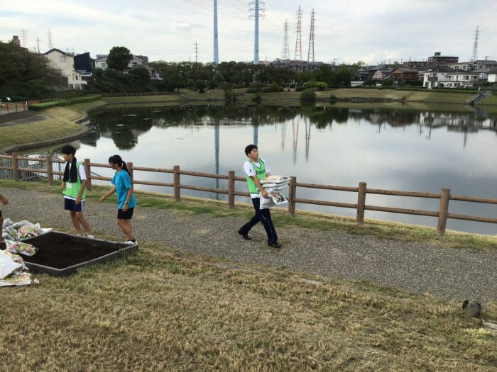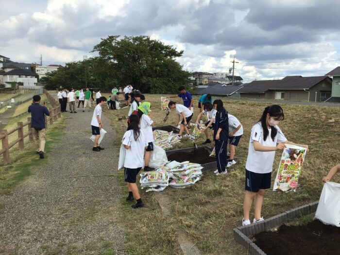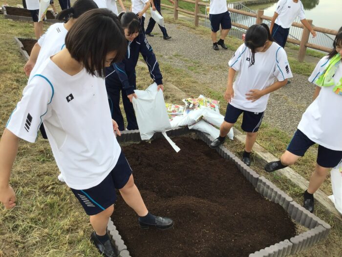 9/14 Today some of the 1st grade students from classes 1-3, 1-4 and 1-5 were able to add the finishing touches to their flower beds at Okuraike Park. After previously weeding these flower beds they now had to top them up with fresh soil and mix each flower bed in well in preparation for the big planting day on October 6th. The students moved 192 bags of soil which is almost 1000kgs or 2688 liters.