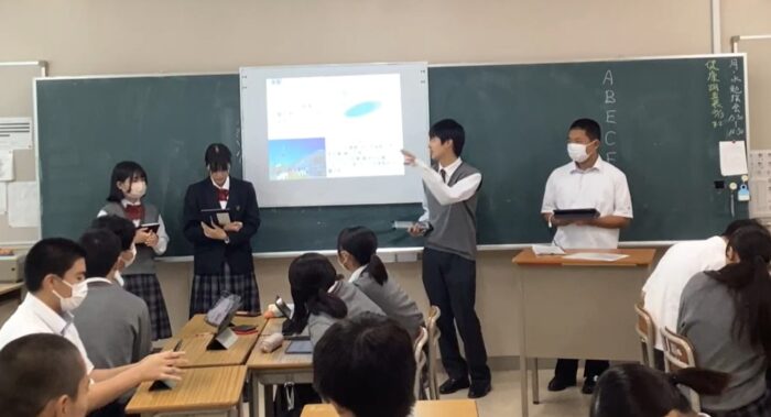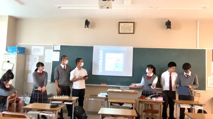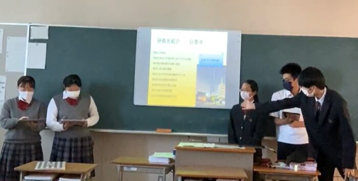 6限目、前半グループの探究DAYの発表を行いました。訪問先の写真を示しながらお寺のご利益を紹介する班もあれば、公園にいた方々の様子をもとに「小さい子と一緒の方におすすめ」など、誰にとって魅力的なのかを考えた班もありました。