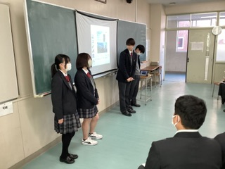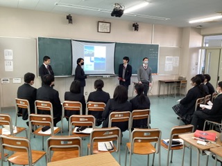 2/2 金曜5・6限は、1年生に研修旅行先の魅力を伝える学年発表会を行いました。クラスの枠を越えて、各教室に別クラス・別コースの3つの班が集まり、研修旅行での経験や学んだこと、感想などを、スライドを使用して発表しました。