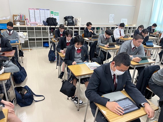 6時間目は、研修旅行先である台湾・韓国・沖縄における過去の戦争被害や現代における戦争の危機について学んだあと、戦争や平和について自分事として考える「究極の選択、あなたならどうする?」に取り組みました。正解がない問いに対してYESかNOかを生徒同士が主張し、反論する白熱した議論が見られました。