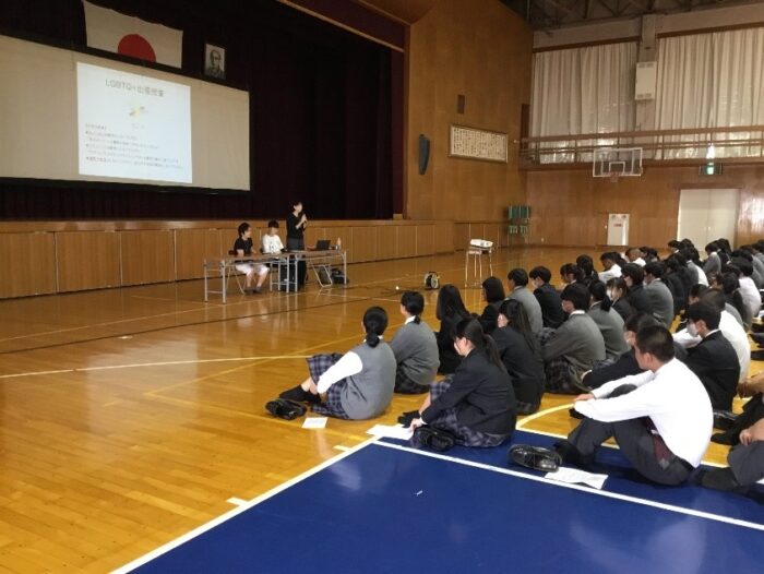 1年生を対象にした教育相談講話が明徳館(体育館)でありました。テーマはLGBTQです。生徒は、NPO法人ASTAの講師の方の話を聞いて、LGBTQの人が実は身近にいて、周りの人たちの何気ない言葉からも、悩み傷ついているという現状を知りました。