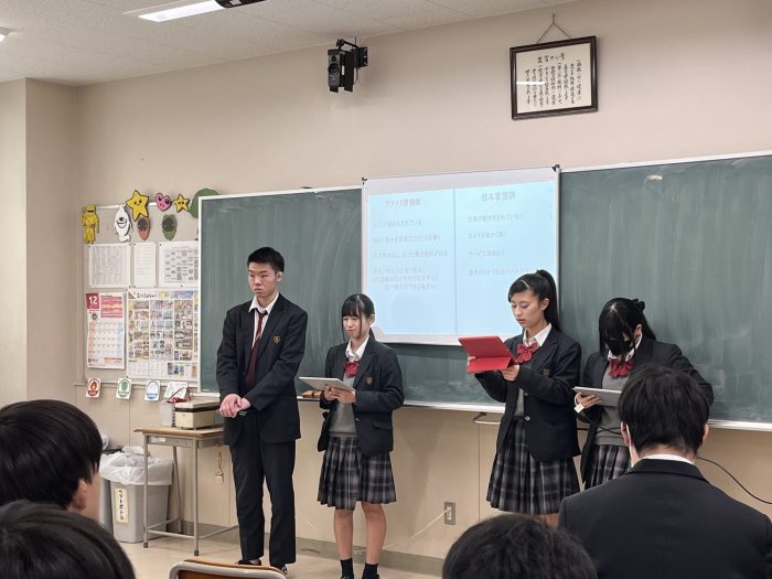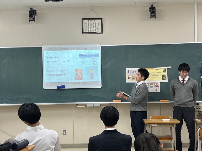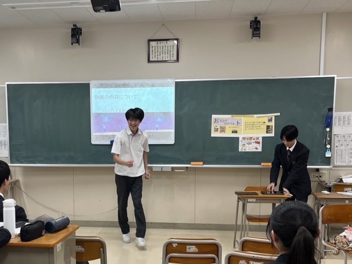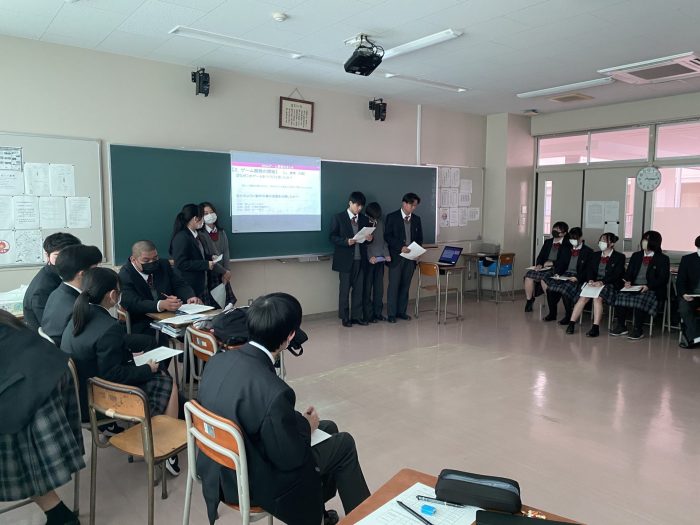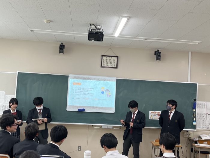 6時間目は、各班が5分間で発表を行いました。限られた時間の中で自分たちの想いも入れながら、工夫をして発表を行っている班が多かった印象です。 これで2学期の総合的な探究の時間は終わりとなります。1学期の発表の様子と比べると、話す内容、目線、声の大きさなど少しづつ成長している点が見られました。残りの3学期の探究学習を経て、生徒がさらなる成長を遂げられるようにサポートしていきたいと思います。