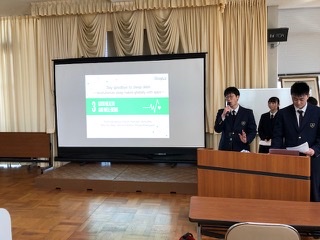 1位の9班は、「Say goodbye to Sleep debt ~revolutionize sleep habits globally with apps~」と題して、睡眠不足が及ぼす悪影響や課題を抽出し、睡眠関連の問題を解決できる方法について提言を行いました。