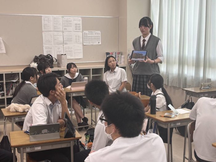 明徳コースでは、先週の探究DAYで撮影した写真やインタビュー記録、良かった点や改善すべき点をパンフレットに加えて、発表の準備を行いました。6限は各班がパンフレットを示しながら、それぞれの研修場所の魅力を自分たちの感想も加えて説明してくれました。道に迷ったり、予定していたランチのお店が混雑していて入れなかったり、実体験からの学びも多く、研修旅行本番に向けた良い準備ができました。