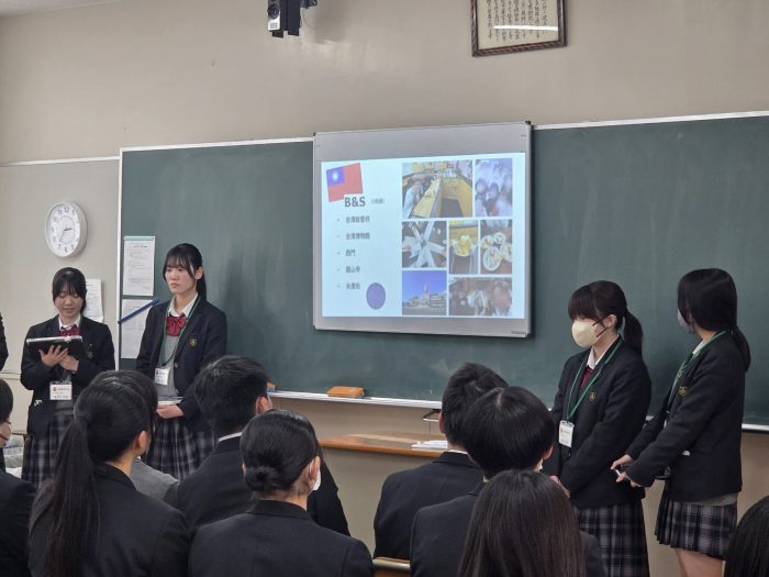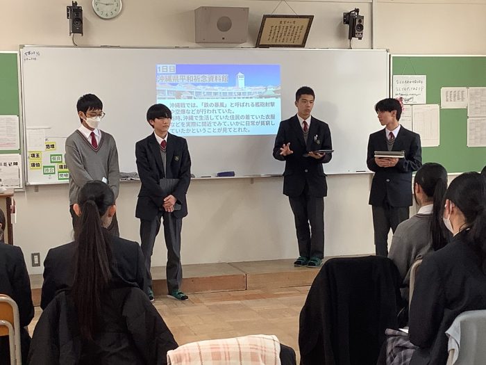 本日はこれまで行ってきた探究活動のまとめとして、一年の学びを発表しました。一年生の前で、これまでの学びを発表する姿は、堂々としており、聞き手もしっかりと聞くことができました。主に研修旅行での話がメインとなりましたが、沖縄コースは戦後80年ということで、今の自分たちにできることを述べていたり、韓国コースは言語が異なるからこそ、人との対面でのつながりの大切さを述べていたり、台湾コースは、日本と台湾の歴史のつながりを述べたりと、自分たちが実際に経験し、学んだことを話すことができていました。一年生も来年度の自分たちの行き先についての話ということもあり、メモをとりながら聞く様子が伺えました。